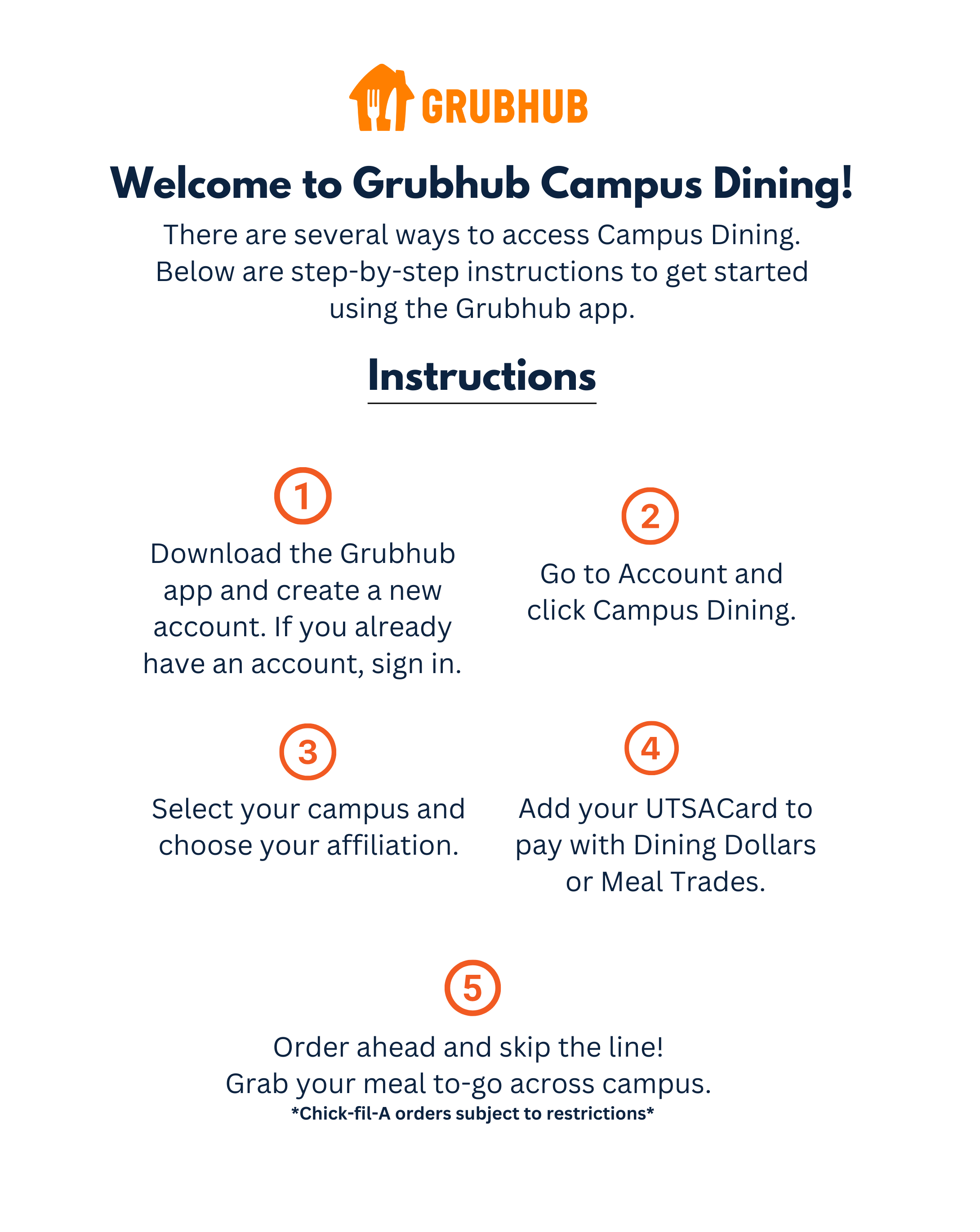 Order ahead from anywhere, anytime with Grubhub Campus Dining. Download the Grubhub App and affiliate with UT San Antonio to get started.